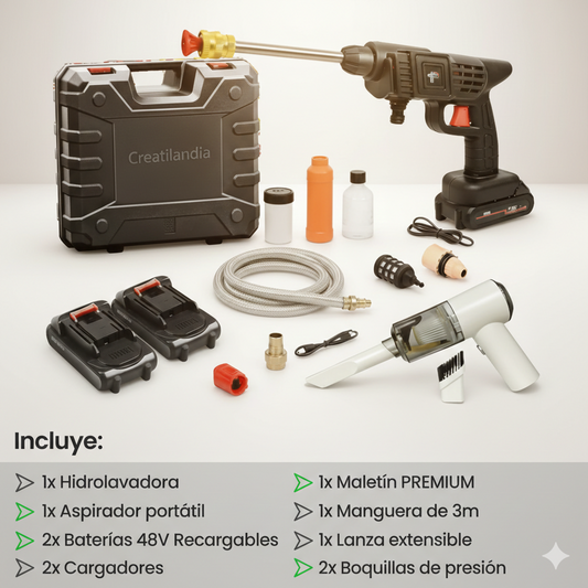 COMBO POWER CLEAN: HIDROLAVADORA + ASPIRADORA PORTÁTIL (DOBLE BATERÍA + MALETÍN)